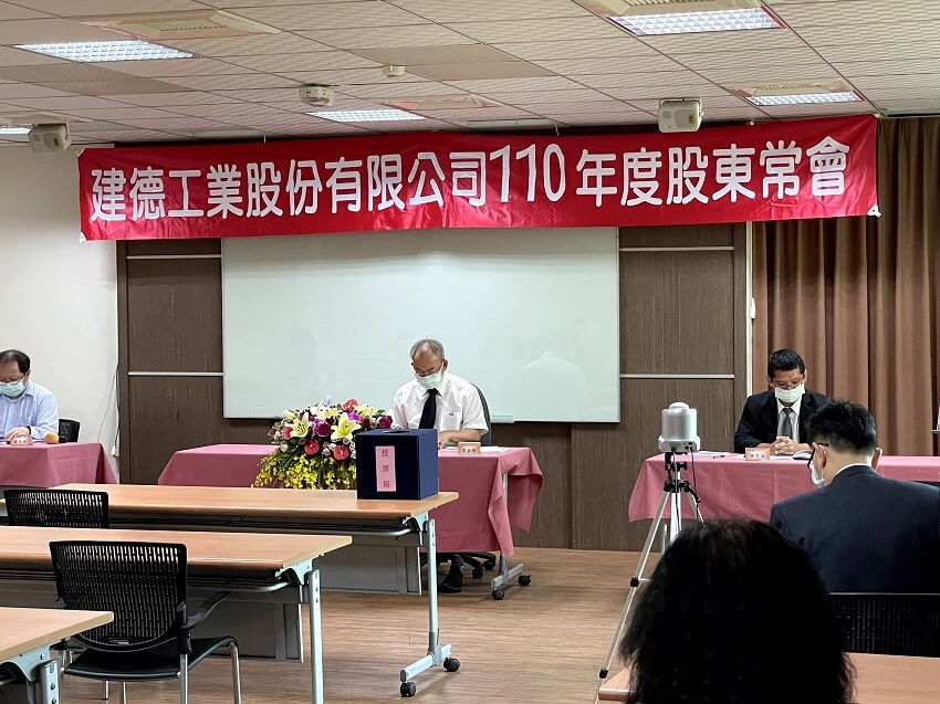 建德工業董事長李金旆主持110年度股東會,會中並通過每股配發現金股利2元。圖/建德工業提供